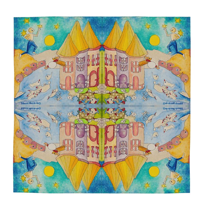 OK304. Ik pluk de mooiste ster voor Jou. Serie: Verhaaltjes voor het kind in Jou. Object: Omslagdoek of sjaal. Materiaal: zijdesatijn. 85 gsm. ID: 331. Maat: 115x115 cm. Design: Olieverf op doek geschilderd door kunstenaar designer Yolande Weerdenburg. Hoogwaardig geprint met de hand door Contrado.